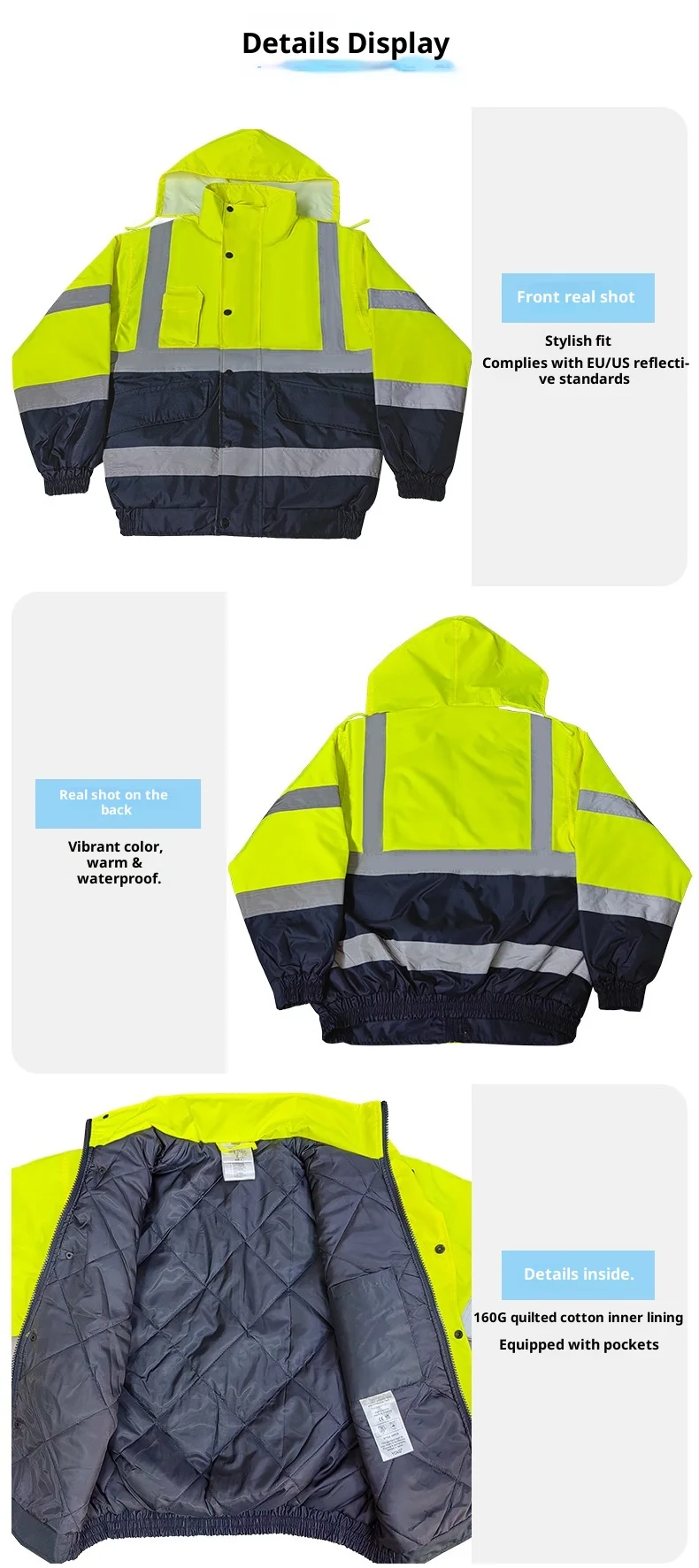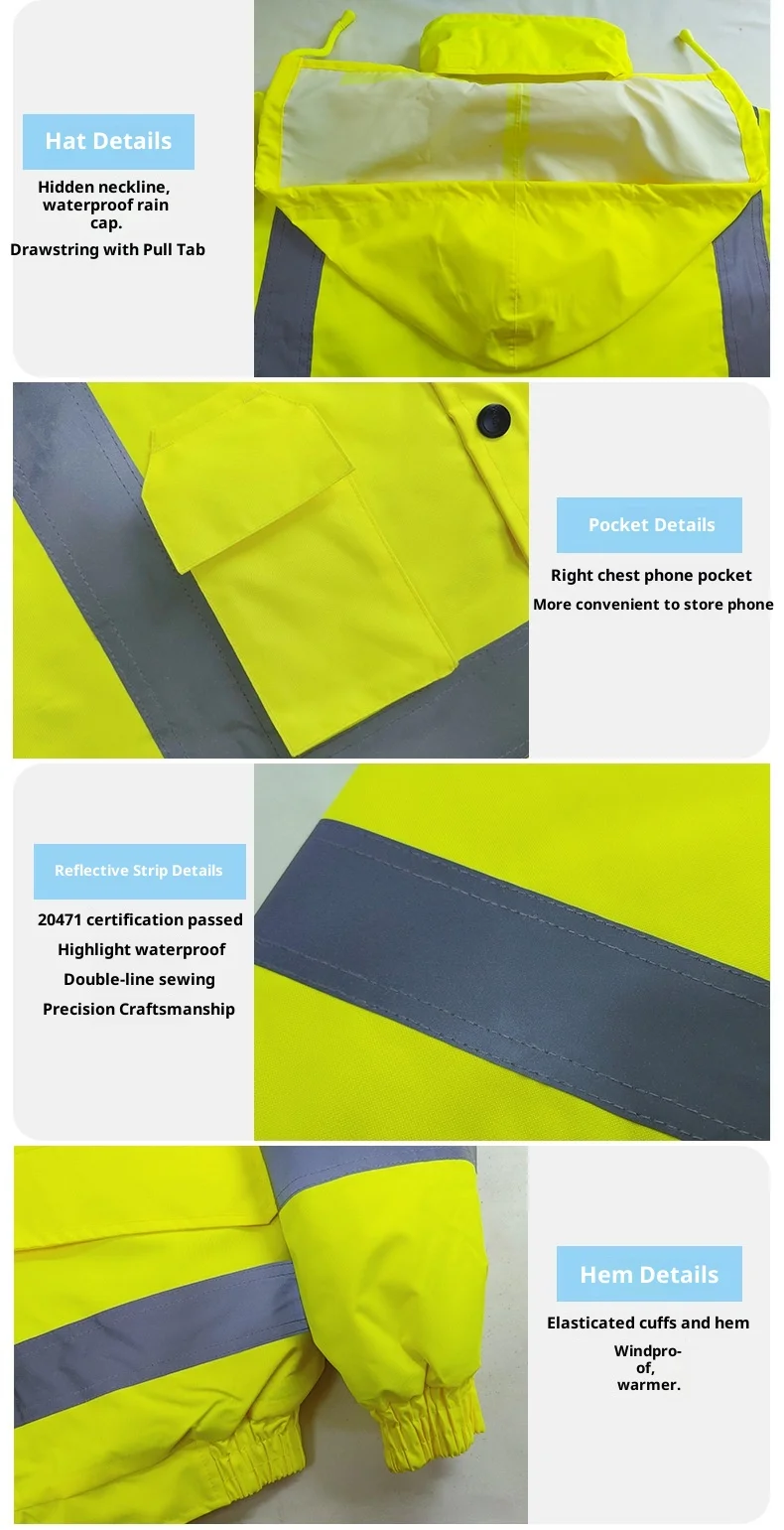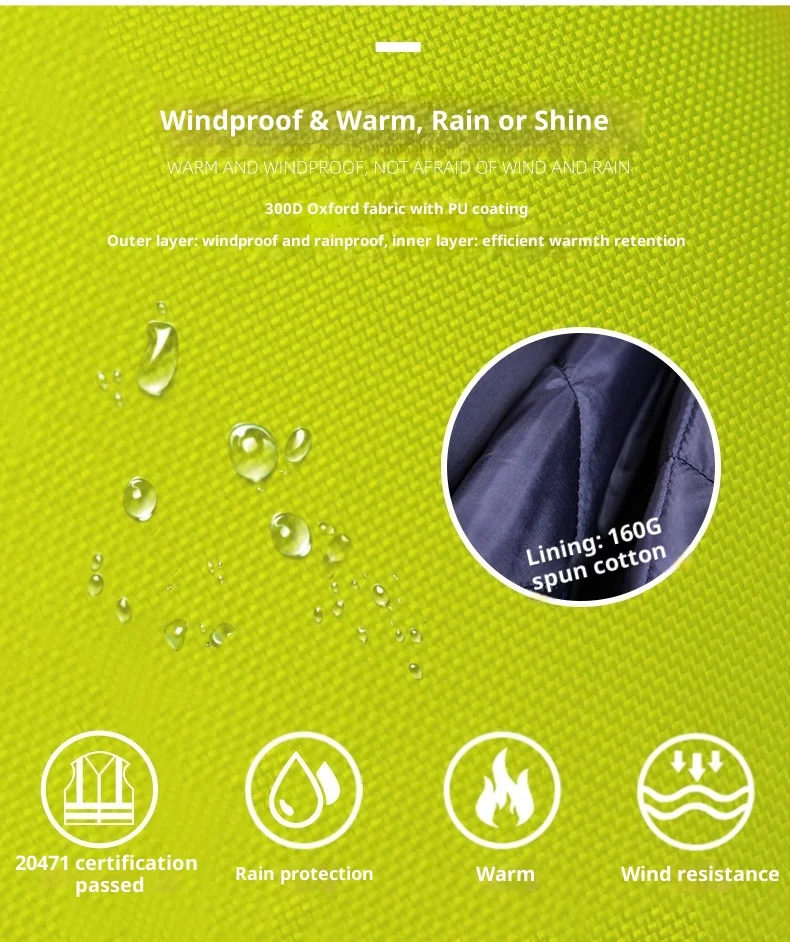Ideal pentru semnalizatori, echipe de-închiderea benzilor și echipele de reparare a autostrăzilor care lucrează în apropierea traficului cu viteză mare-pe vreme rece și umedă.Operațiuni de depozitare și logistică